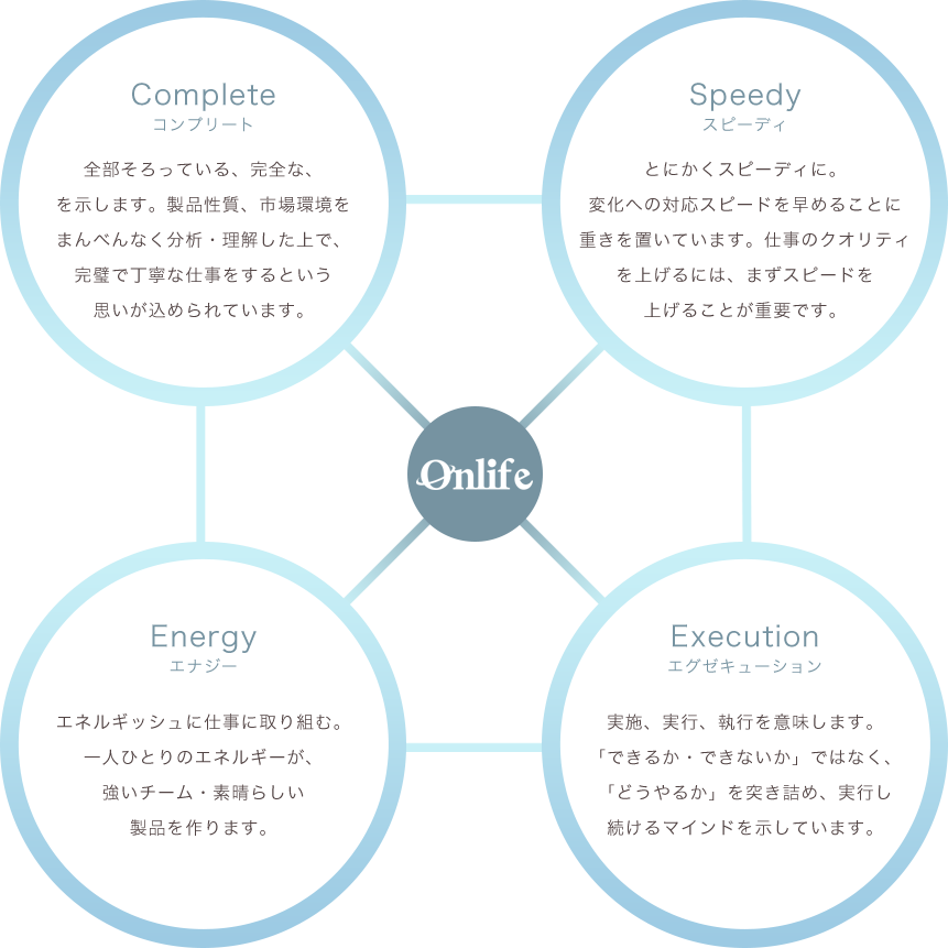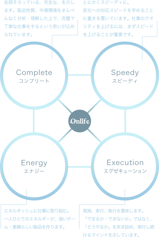 現在、株式会社オンライフの展開しているメイン事業は、Eコマース事業、そして飲食事業です。この理念には、それらの事業をより大きく、高品質に仕上げていくということだけでなく、事業目的として「人々の生活を豊かにしたい」というベースとなる思いが含まれています。